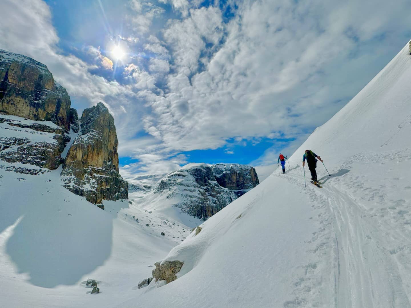 Im Winter sind die Dolomiten ein Traum in weiss. Skitouren im Rosengarten, Skitouren im Grödner oder Skitouren im Villnößer Tal, gehören zum Schönsten was man mit Skiern machen kann. Die Aufstiege und die Abfahrten zwischen Felswänden, sowie durch breite Täler und schmale Rinnen sind einzigartig und im Alpenraum kaum zu topen. Als erfahrener Dolomiten Bergführer geht es mit mir sicher auf Tour, mit dem einen oder anderen Geheimtipp in der Weste. Auch die Skitouren im Fassatal, in der Nacharprovinz Trient, sind immer einen Abstecher wert und man kann hier auch eine ganze Skitourenwoche locker verplanen. Vor meiner Haustür sozusagen befindet sich die die Seiser Alm, wohl eher für ihre Skipisten und Loipen bekannt, aber auch für Skitourengeher gibt es einige lohnenswerte Anstiege. Die Skitour auf den Plattkofel (2.980 m) oder die sogenannte Antermoia Runde sind hierbei wohl die Königsetappen weit und breit und nur für erfahrene Tourengeher empfehlenswert, aber es geht auch gemütlicher.